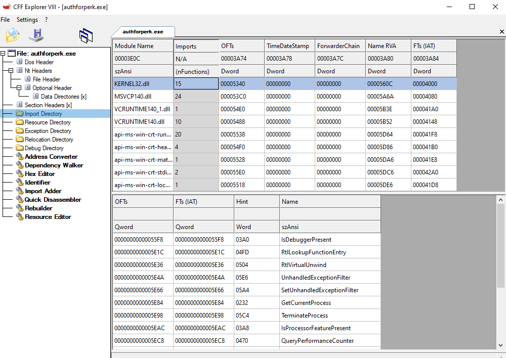 After I have downloaded the zip archive and unziped it, file authforperk.exe (SHA256 6f65c2ef2a828dff2247c2c5a377c91cf6c1fedd93116e01544ecbd9f5234093) is the one that is going to be the subject of analysis. As always, let’s check for static properties of this PE64 executable first.