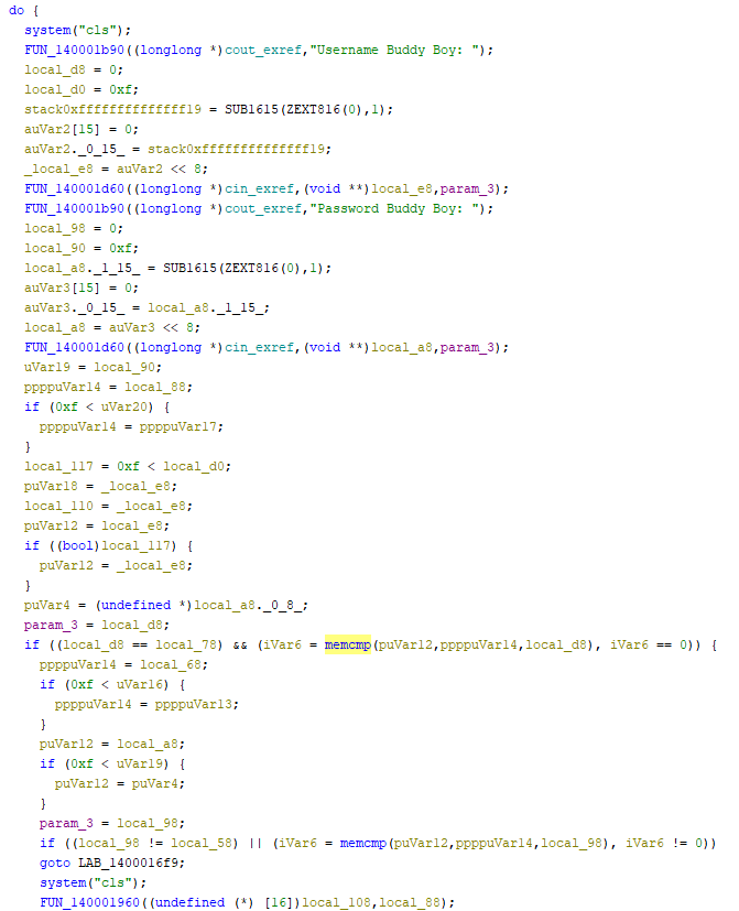 What I always do with these types of challenges is to search for notable strings/outputs and check where they are appearing in the code through cross referencing. As we can see in above photo, “Username Buddy Boy:” and “Password Buddy Boy: ” are two strings that are outputted in function FUN_140001290. This flow is a typical one: prompt user for username and password and then compare it with the secret. As I didn’t want to spend too much time on analyzing how and where the secret is contained, I decided to focus on function that does the comparison (memcmp). This is certainly going to appear as breakpoint during dynamic analysis.