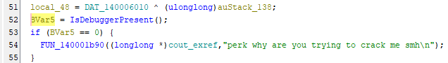 FUN_140001290 is the function that utilizes this API and checks if we have debugger attached. If we do, program ends with the message.