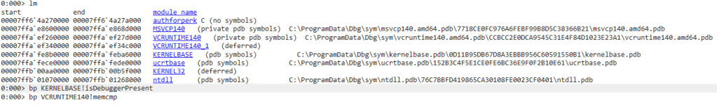 As we can see, two modules are of particular interest to us since they’re the ones that are implementing functions that we want to set breakpoints on: KERNELBASE (isDebuggerPresent) and VCRUNTIME140 (memcmp). We can set those breakpoints with