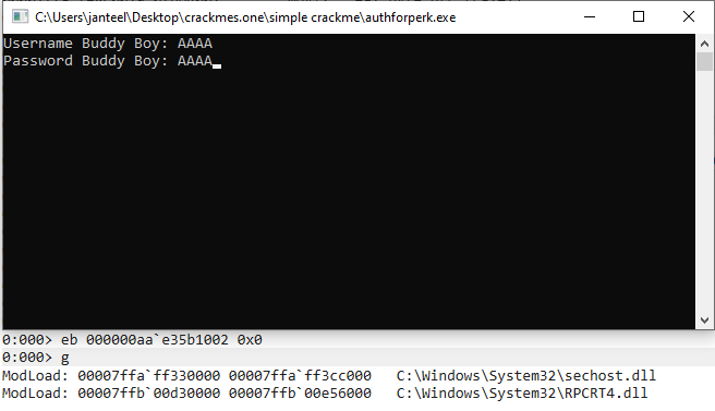 and continue with execution. Now that we have successfully bypassed the anti-debugging protection, we can input arbitrary username and password in the console. Let’s fill it with couple of 0x41s.