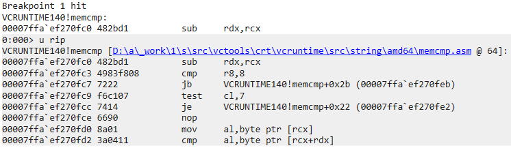 Now we hit memcmp breakpoint. Perfect time to examine its instructions and try to catch the comparison steps.