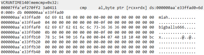 Easily we can spot CMP instruction: lower eight bits of EAX are holding pointer to our input. Let’s put the breakpoint at 0x7ffaef270ff2 and continue. Now that we hit the CMP, we can dump memory contents at 0xaae33ffad0 revealing username and password (miah/bigballs666).