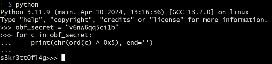 Right before the first instruction gets executed, w9 register holds a value of 0x3. With the add w9, w9, #2, it gets increased to 0x5 and this is our key that the next instruction uses for XOR operation (eor in ARM assembly) as it decodes each byte of obfuscated secret and compares it with our input buffer. As our input is “AAAAAAAA”, execution ends as the first character of secret is NOT 0x41. What we can do at this point is to either bruteforce all chars from ASCII charset, which is a bit lengthy process involving lots of debugger restarts (yes, I know I could use TTD), OR, we could just XOR each letter of our secret with 0x5 and get the flag. Yes, you guessed it right, simple python is getting the job done: