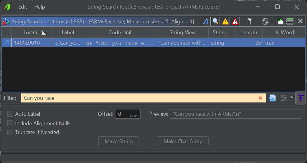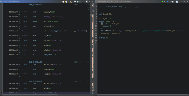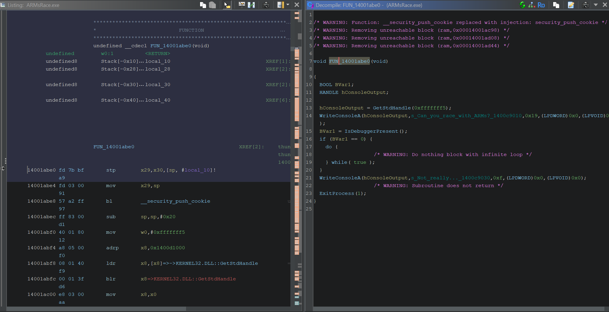 Ghidra reveals that string “Can you race with ARMs?” is being used in function FUN_14001abe0 that looks like this: