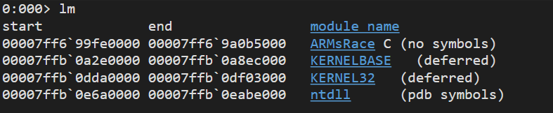 It would be handy to place first breakpoint to the start of the main, but how do we do that? Well, as Ghidra has already told us that the main starts at the offset of 0x1abe0 from the image base (0x14000000), we have to calculate where this address is when image is loaded into memory. WinDbg’s list modules command (lm) comes handy for that: