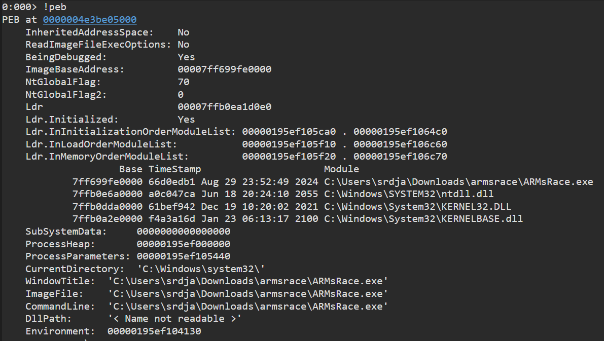Now that we know that 0x7ff699fe000 is the image base address, if we add 0x1abe0, we get 0x7ff699ffabe0 and that is the start of the main function where we can put our first breakpoint with bp. Now, remember that nasty anti-debugging routine that wants to prevent us acquiring that flag? Let’s use one cool feature of WinDbg called pseudo registers, and one in particular that points to the start of PEB structure called peb. You can list the entire structure with !peb command and check for all particularities of your running process: