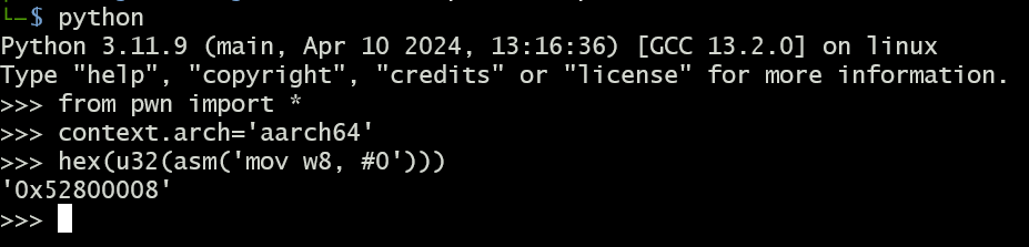 For this task, we’re going to use pwntools as it provides elegant way to produce hex representation of AArch64 assembly instruction that we need: